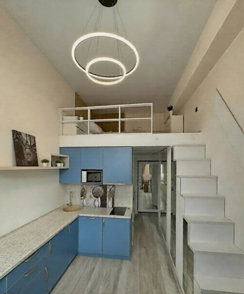 Общая площадь - 23 м2. с учетом 2-го уровня, где располагается спальное место.