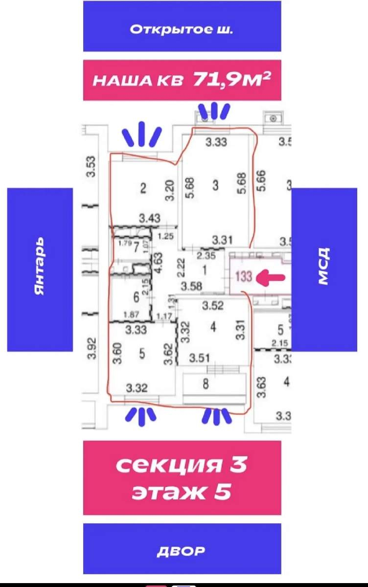 1. Просторная и светлая трехкомнатная квартира расположена на «золотом» 5-м этаже - идеальный баланс тишины и комфорта.