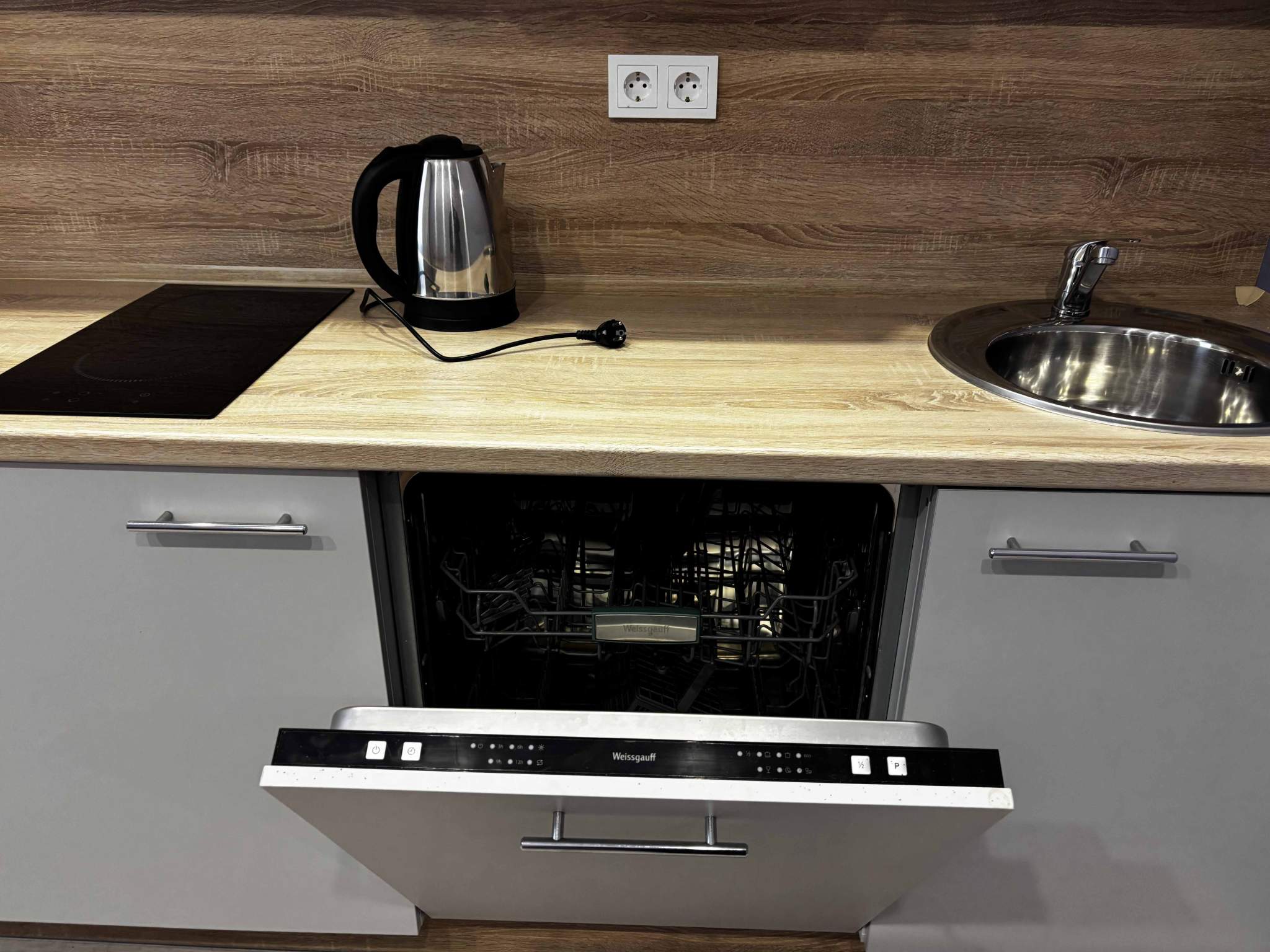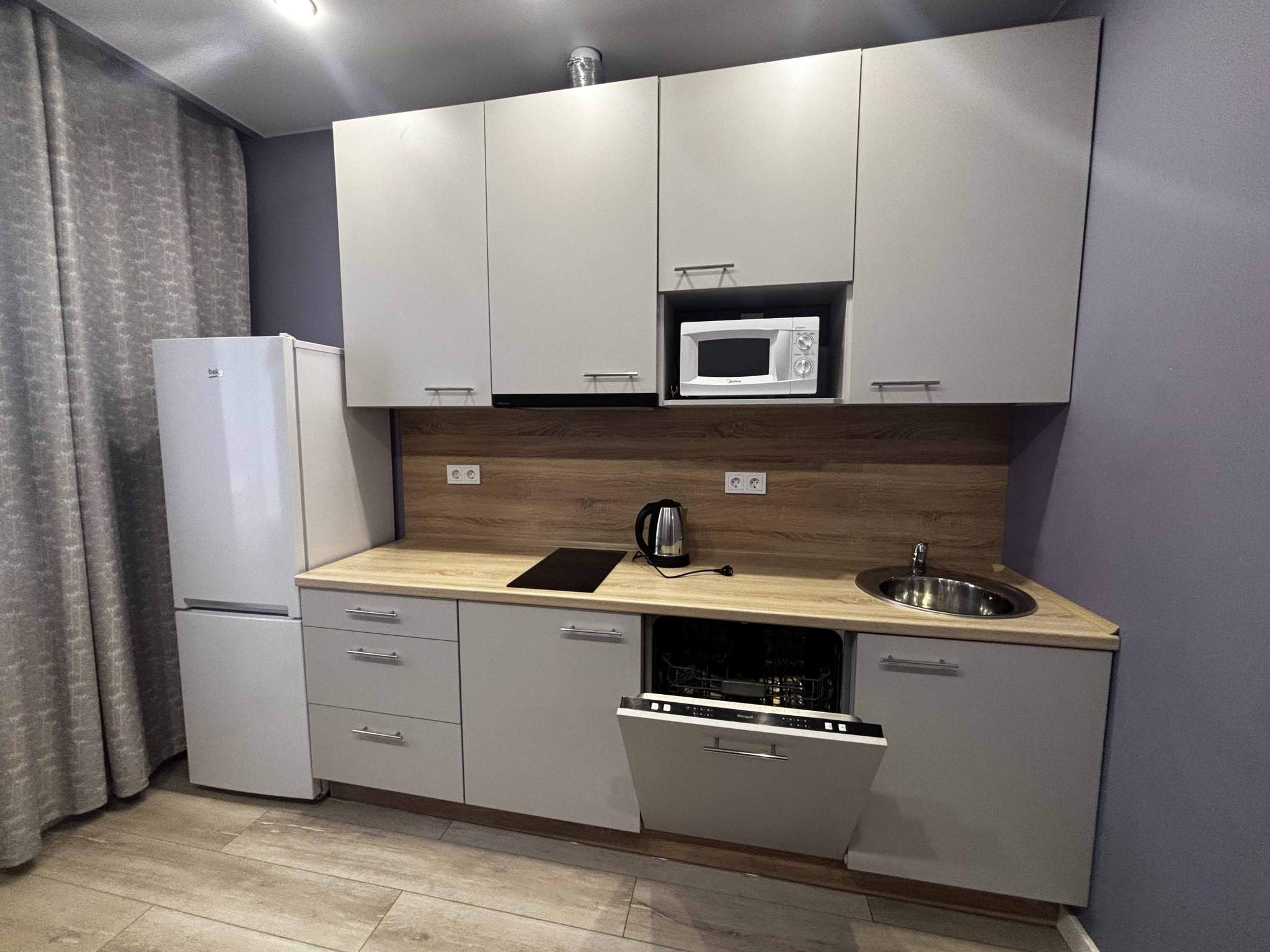 Кухня: Гарнитур, варочная панель, вытяжка, микроволновка, холодильник, посудомоечная машина.