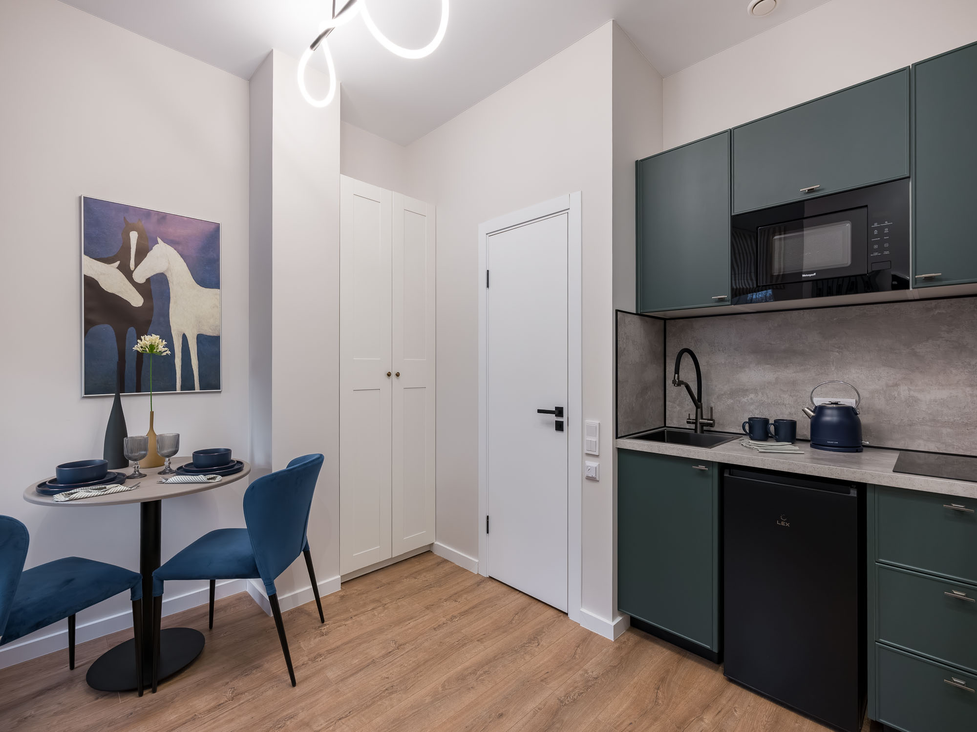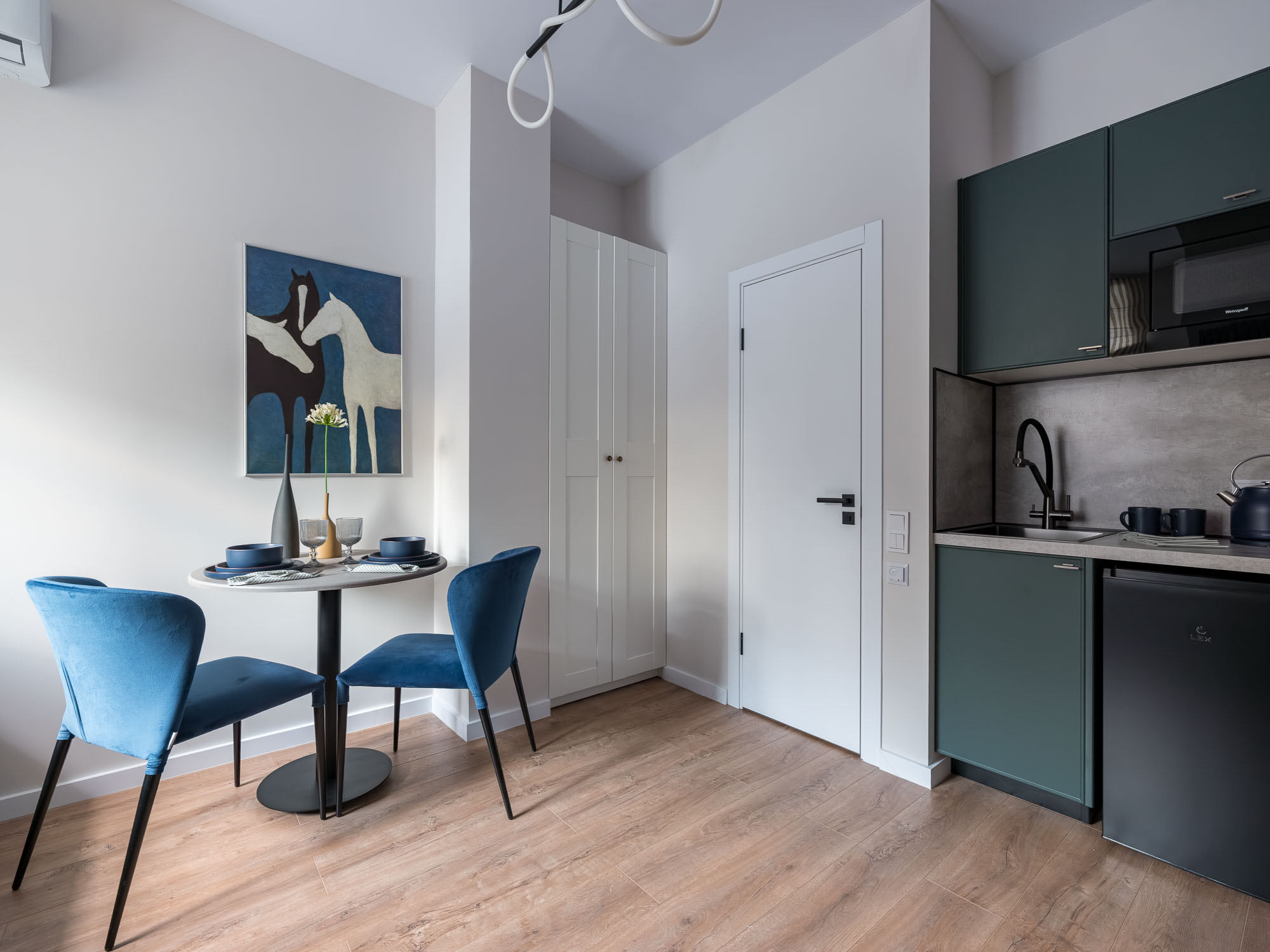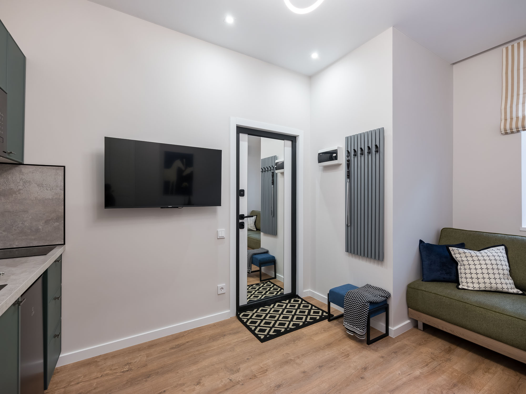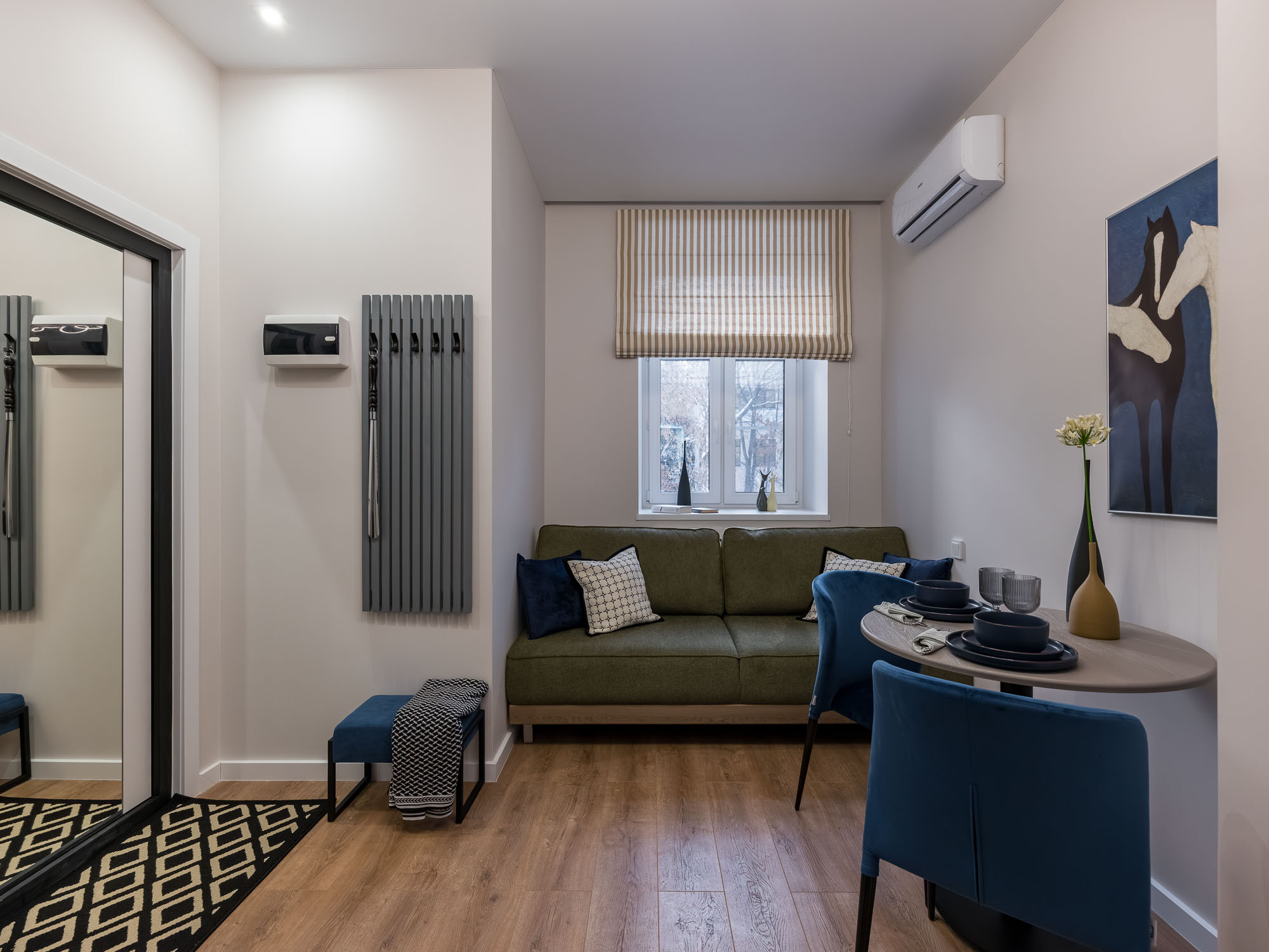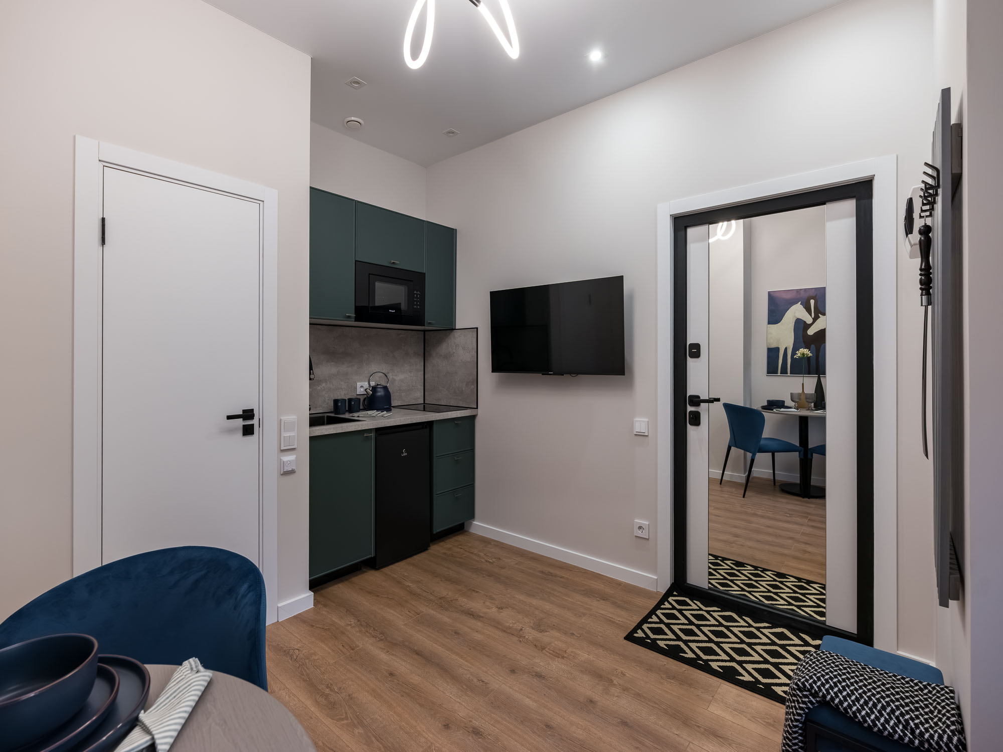 Студия 18.6 м2 в историческом центре Москвы. Улица Большая Татарская, дом 20, строение 2. Выполнен новый дизайнерский ремонт с полной заменой всех коммуникаций. Высокий уровень шумоизоляции — 62 Дб (уровень банковских переговорных). Дом расположен внутри Садового кольца, в тихом районе, пешая доступность метро.