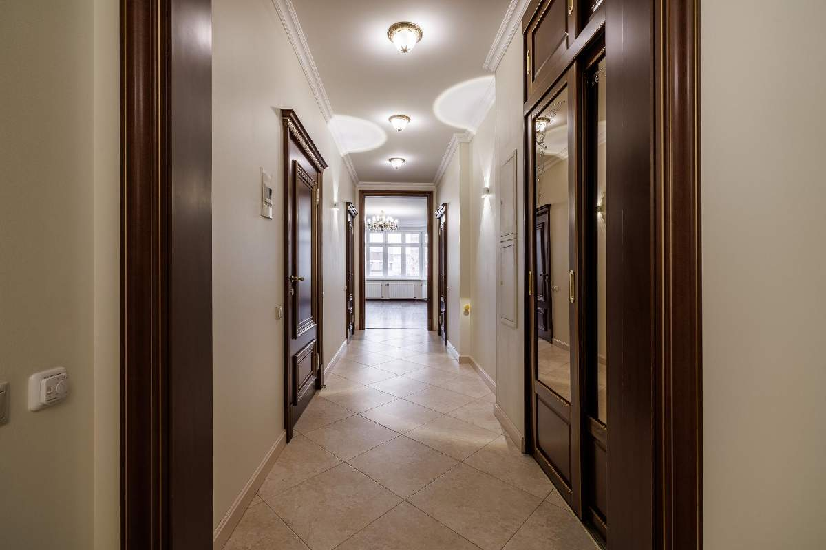 Предлагаемая квартира находится на 9 этаже 10 этажного дома и занимает почти целое крыло. Таким образом на этаже располагается только 2 квартиры, что обеспечивает приватность и тишину.
